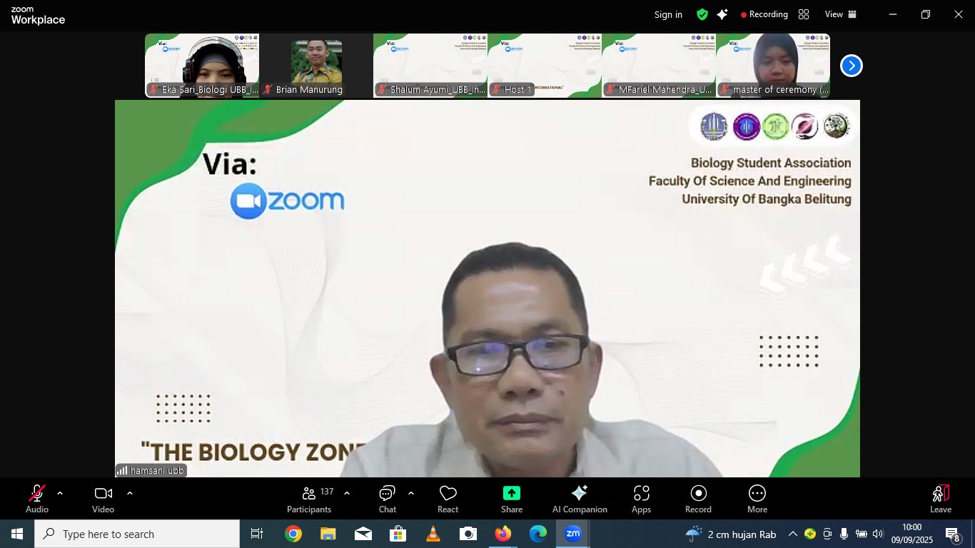 Bangka, UBB – Himpunan Mahasiswa Biologi (HIMABIO) Universitas Bangka Belitung kembali menggelar Biozone 11th International dengan tema “Rehabilitation of Post-Tin Mining Ecosystems: Integrating Botany, Microbiology, and Zoology for Sustainable Conservation.” Acara pembukaan berlangsung secara daring melalui Zoom Meeting pada Selasa (9/9), pukul 09.00 WIB.