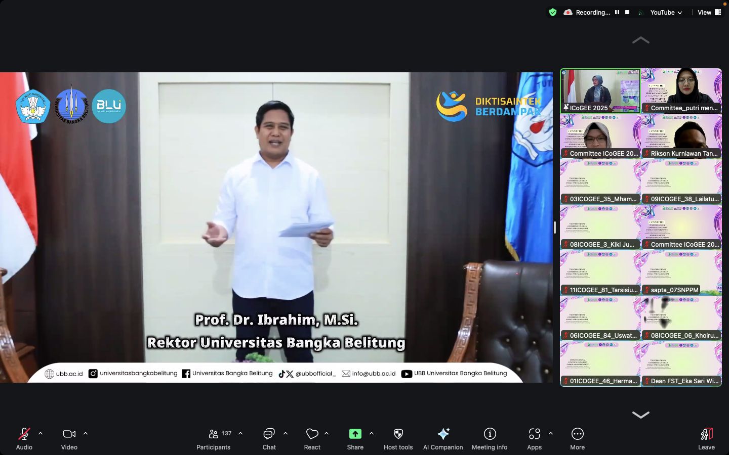 Bangka, UBB-- Fakultas Sains dan Teknik Universitas Bangka Belitung (UBB) sukses menyelenggarakan dua agenda ilmiah besar berskala nasional dan internasional, yakni The 7th International Conference on Green Energy and Environment (ICoGEE 2025) dan Seminar Nasional Penelitian dan Pengabdian kepada Masyarakat (SNPPM) ke-9, yang berlangsung secara virtual pada 21–22 Oktober 2025.